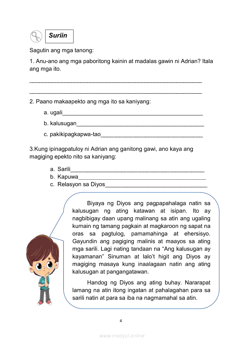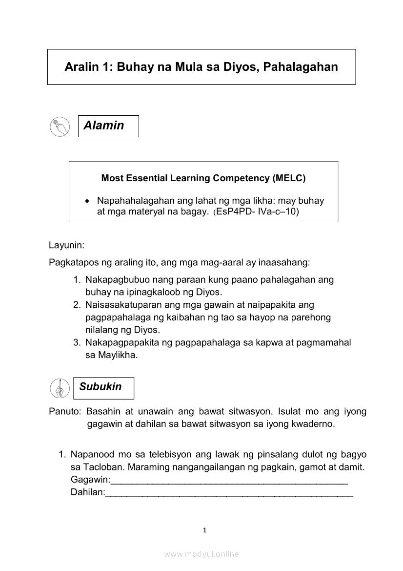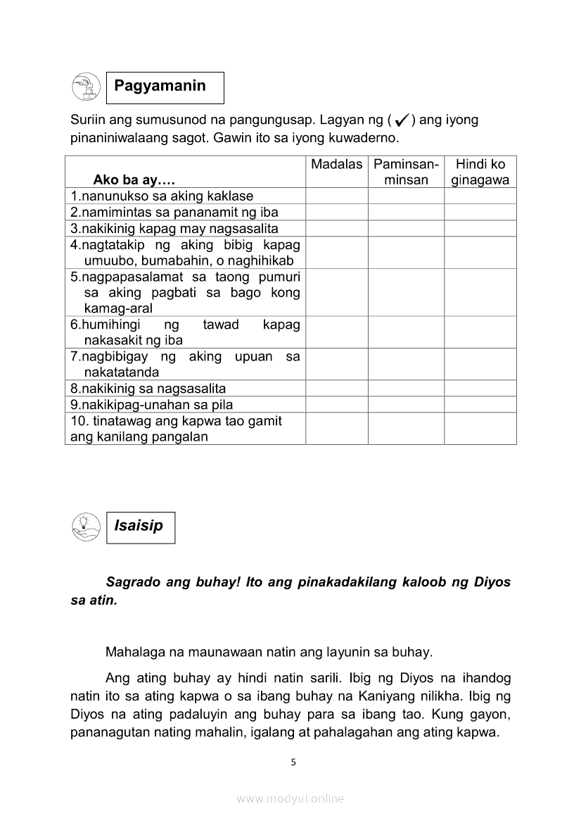 Edukasyon sa Pagpapakatao Ikaapat na Markahan – Modyul 1: Buhay na Mula sa Diyos, Pahalagahan (Linggo: Una)May 26, 2021 Grade 4Kiumo M901 Tablet for Kids — comprehensive protection in learning, safety, and entertainment for as low as **₱2,399!. Edukasyon sa Pagpapakatao 4 4th QuarterRelatedEdukasyon sa Pagpapakatao Ikaapat na Markahan – Modyul 5: Mga Yamang Likas, Ating Alagaan (Linggo: Ikalima)Edukasyon sa Pagpapakatao Ikaapat na Markahan – Modyul 2: Pamilya Tungo sa Isang Mapayapang Komunidad (Linggo: Ikalawa)Edukasyon sa Pagpapakatao Ikaapat na Markahan – Modyul 3: Mga Hayop na Ligaw at Endangered, Kalingain at Alagaan (Linggo: Ikatlo)Edukasyon sa Pagpapakatao Ikaapat na Markahan – Modyul 4: Pangangalaga sa Kapaligiran, Tanda ng Paggalang sa Diyos na Lumikha (Linggo: Ikaapat)MUSIC Ikaapat na Markahan – Modyul 4a: Tempo at Texture