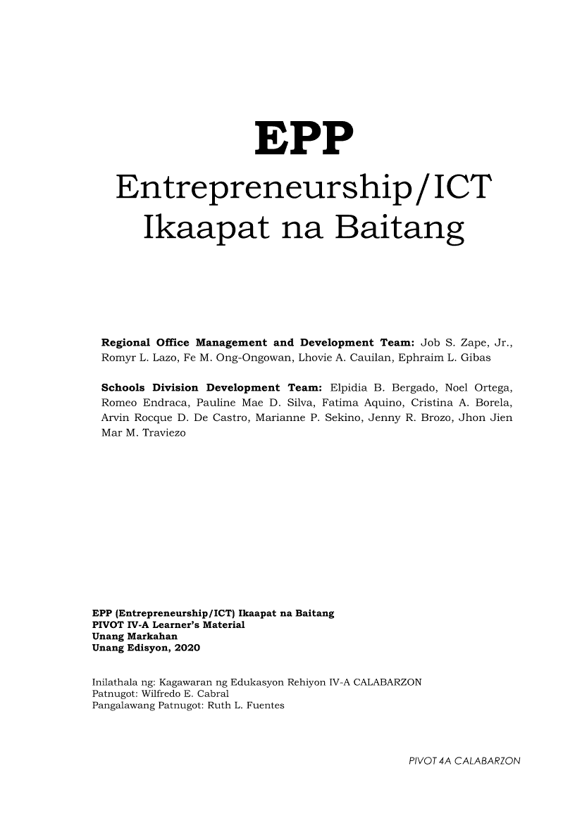 Edukasyong Pantahanan at Pangkabuhayan 4 PIVOT Module EPP ICT EntrepreneurApr 22, 2021 Grade 4Kiumo M901 Tablet for Kids — comprehensive protection in learning, safety, and entertainment for as low as **₱2,399!. Edukasyong Pantahanan at Pangkabuhayan 4RelatedEPP - ICT Markahan 4 - Modyul 8: PAGSAGOT AT PAGPAPADALA NG EMAIL NA MAY ATTACHMENTEPP - ICT Markahan 4 - Modyul 5: PAGGAWA NG DOKUMENTO NA MAY LARAWAN GAMIT ANG WORD PROCESSING TOOLEPP - ICT Markahan 4 - Modyul 1: KAHULUGAN AT KAHALAGAHAN NG ENTREPRENEURSHIPEPP - ICT Markahan 4 - Modyul 2: KATANGIAN NG ISANG ENTREPRENEUREPP - ICT Markahan 4 - Modyul 6: PAGGAWA NG TABLE AT TSART GAMIT ANG WORD PROCESSOR AT ELECTRONIC SPREADSHEET TOOL