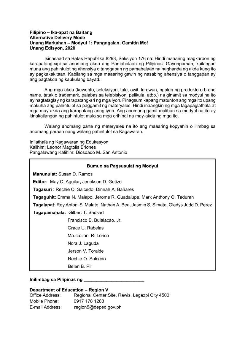Filipino 4 Modyul 1 Pangngalan, Gamitin Mo!Apr 22, 2021 Grade 4Kiumo M901 Tablet for Kids — comprehensive protection in learning, safety, and entertainment for as low as **₱2,399!. Filipino 4RelatedFilipino 4 Ikaapat na Markahan – Modyul 4 Panayam Gamit ang Iba’t Ibang Uri ng Pangungusap at Pagsasagot ng mga Tanong Tungkol sa Editorial CartooningFilipino 4 Ikaapat na Markahan – Modyul 3 Pagbibigay ng Paksa sa Teksto at Kahulugan ng Salita sa Pamamagitan ng Pormal na Depinisyon ng SalitaFilipino 4 Ikaapat na Markahan – Modyul 1: Pagbibigay ng Direksyon, Paggamit ng mga Uri ng Pangungusap sa Pagpapakilala ng Produkto at Pagsagot ng mga Tanong sa Napanood na PatalastasKiumo M901 Tablet for Kids --- Android Tablet 6GB+128GB Study Tablet.