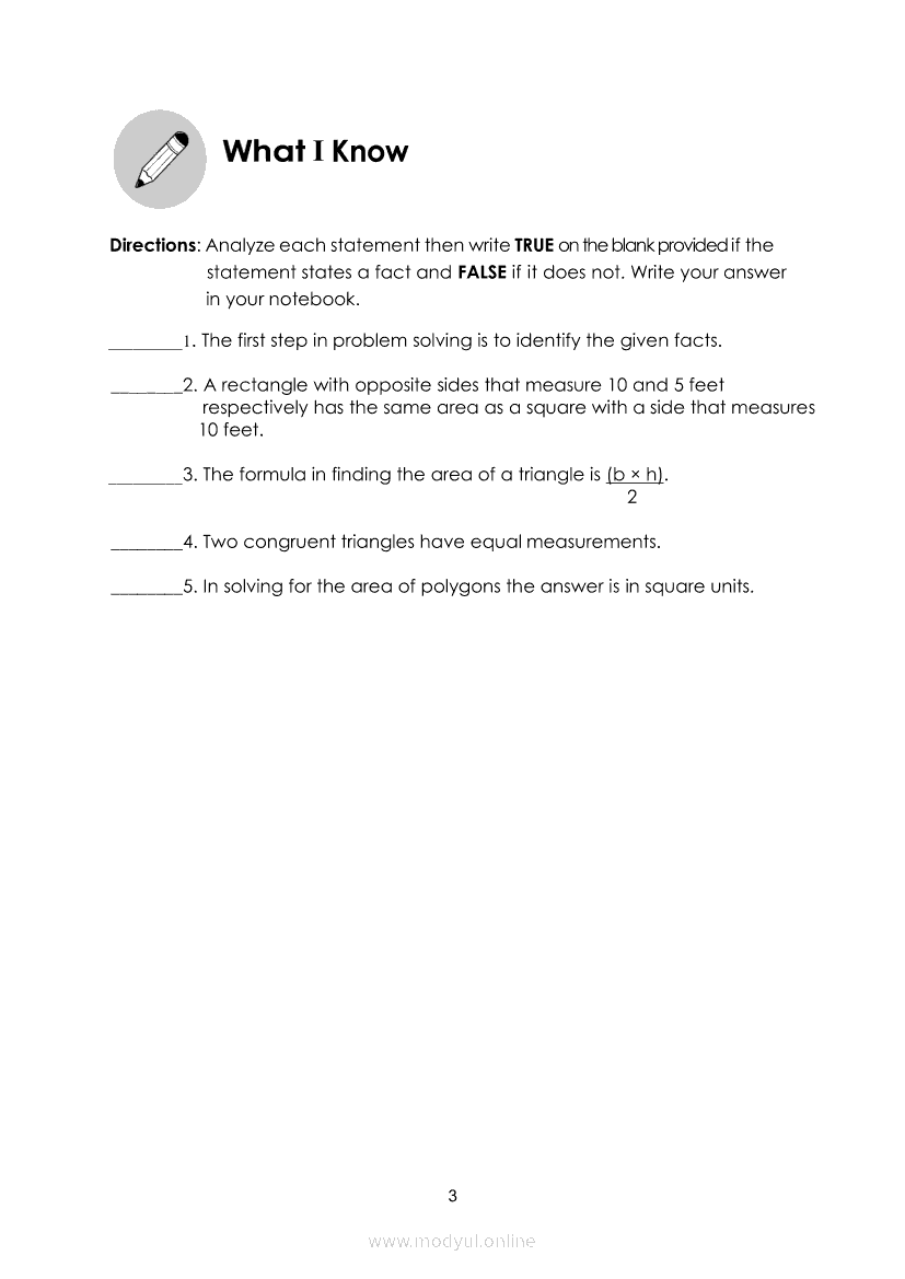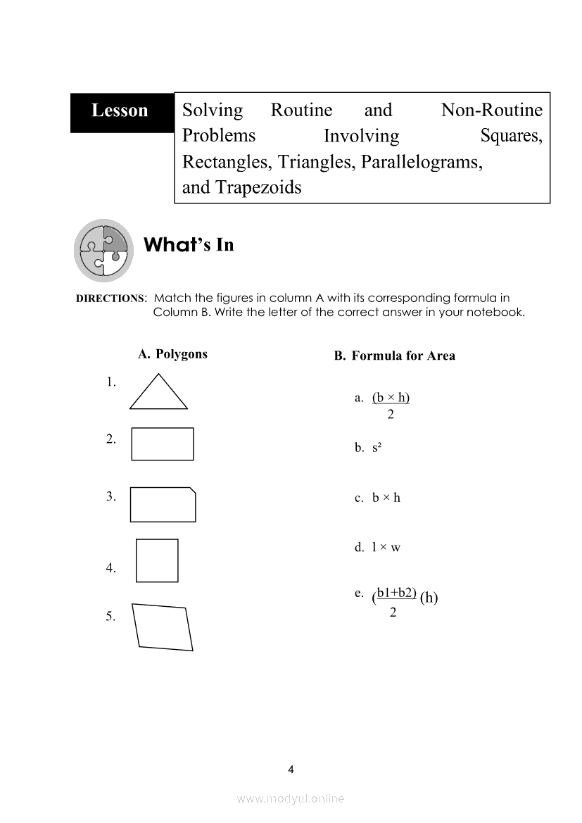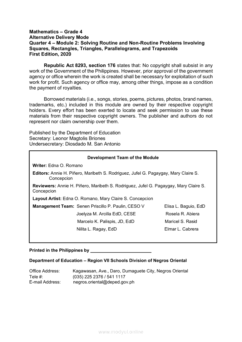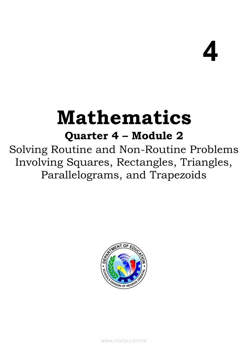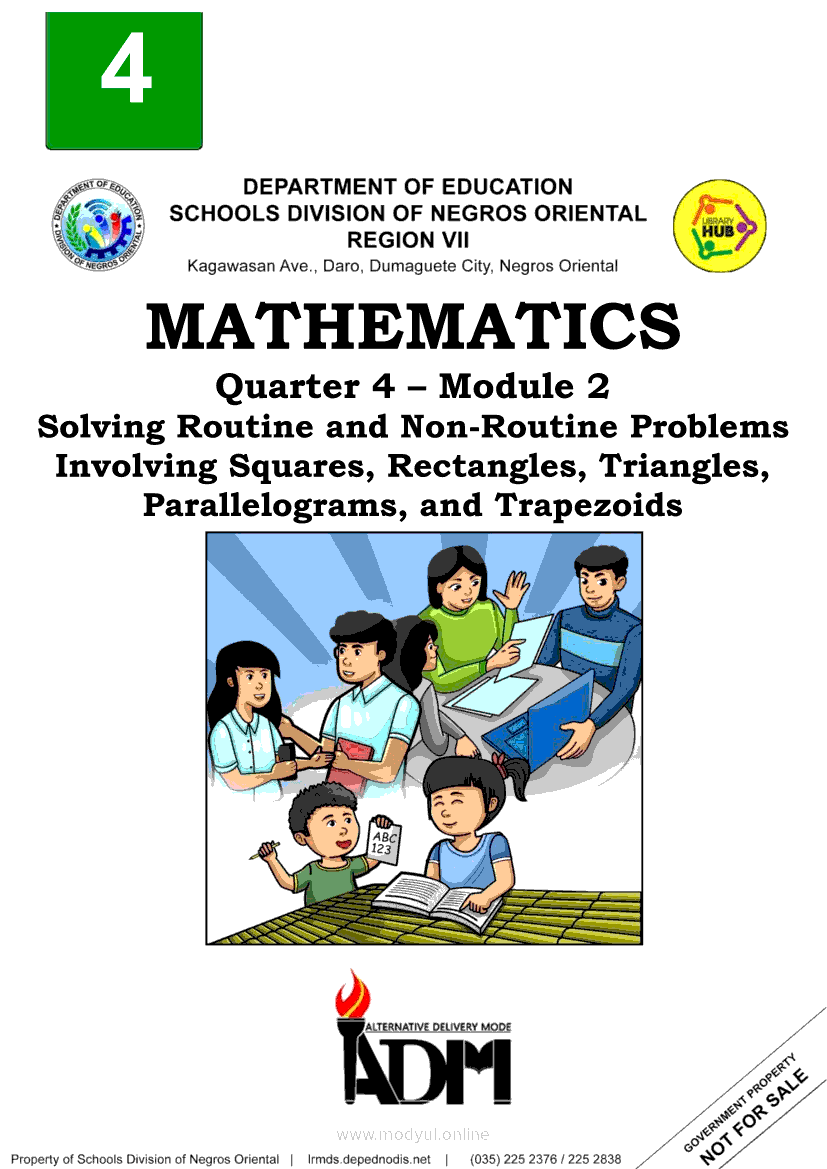 MATHEMATICS Quarter 4 – Module 2 Solving Routine and Non-Routine Problems Involving Squares, Rectangles, Triangles, Parallelograms, and TrapezoidsMay 26, 2021 Grade 4Kiumo M901 Tablet for Kids — comprehensive protection in learning, safety, and entertainment for as low as **₱2,399!. Math 4 4th QuarterRelatedMATHEMATICS Quarter 4 - Module 1 Finding the Area of Irregular Figures Made Up of Squares and Rectangles and Triangles, Parallelograms and TrapezoidsMATHEMATICS Quarter 4 – Module 8 Expressing and Explaining the Outcomes in a Simple ExperimentMATHEMATICS Quarter 4 – Module 7 Recording Favorable Outcomes and Solving Routine and Non-Routine Problems in a Simple ExperimentMATHEMATICS Quarter 4 – Module 5 Collecting and Organizing Data in Tabular Form and Presenting Them in a Single/Double Horizontal or Vertical Bar GraphMATHEMATICS Quarter 4 – Module 6 Interpreting/Drawing Inferences Based on Data Presented and Solving Routine and Non-Routine Problems in a Single/Double Vertical or Horizontal Bar Graphs