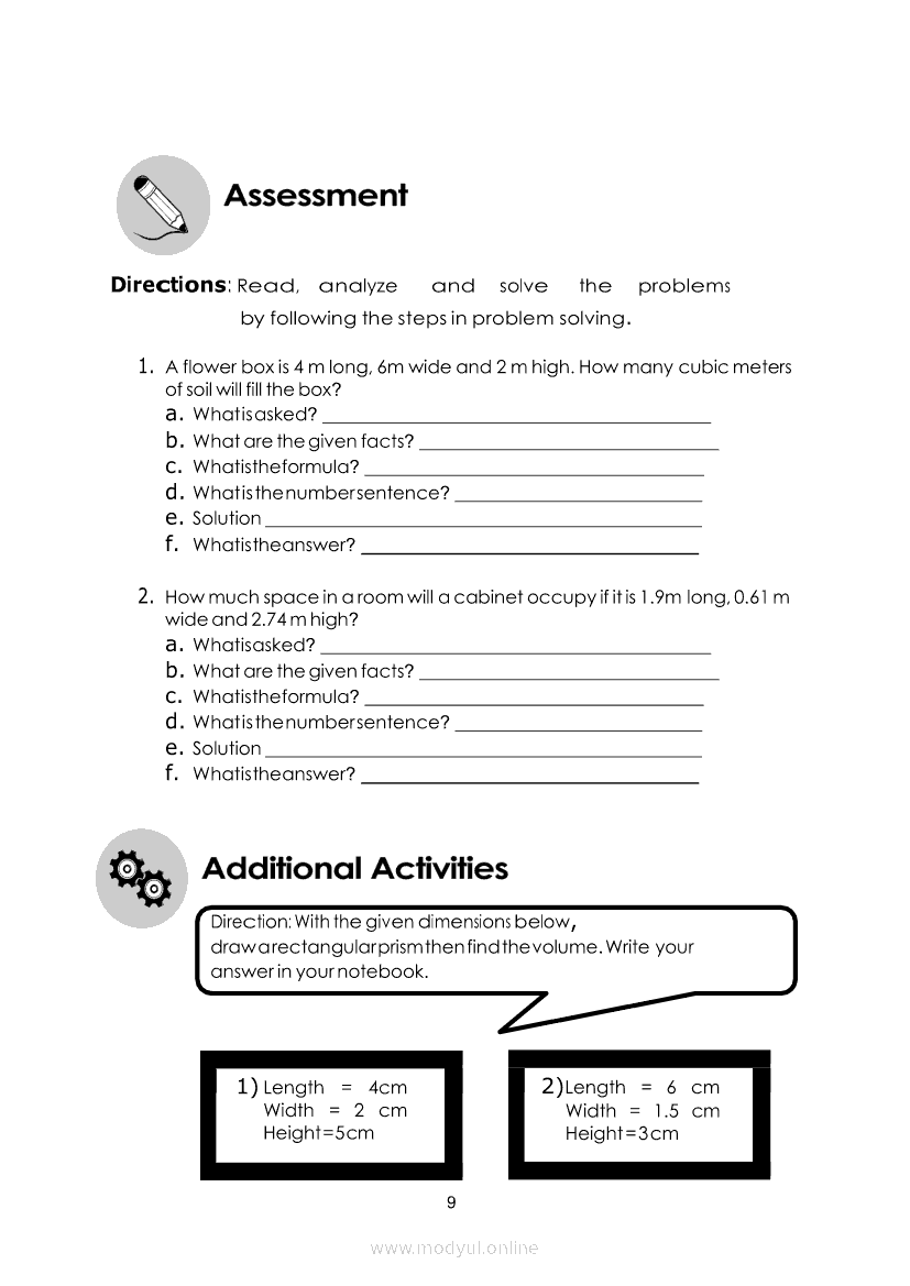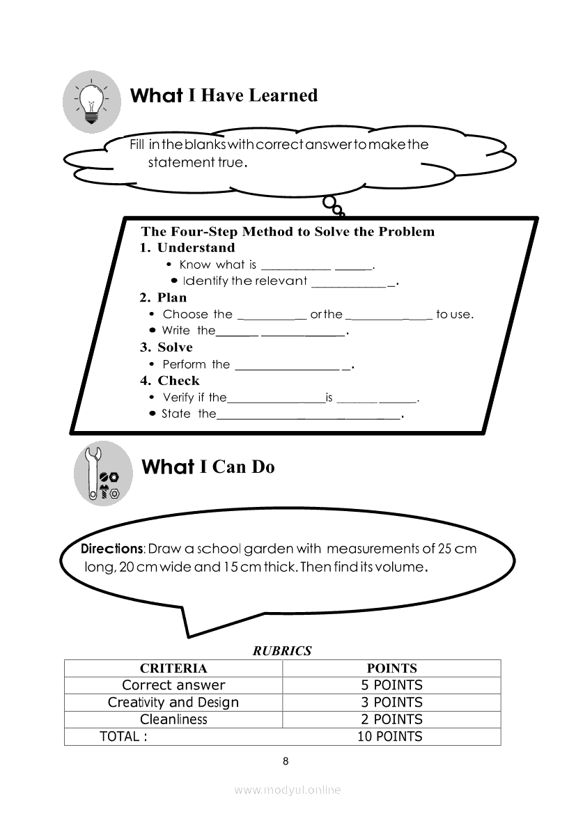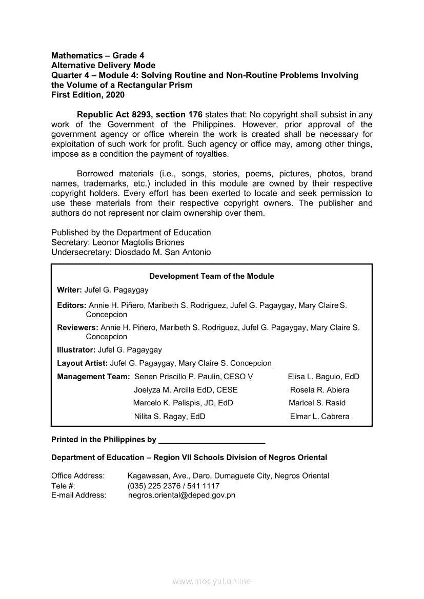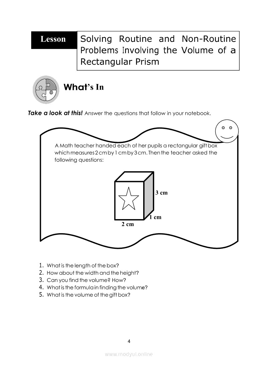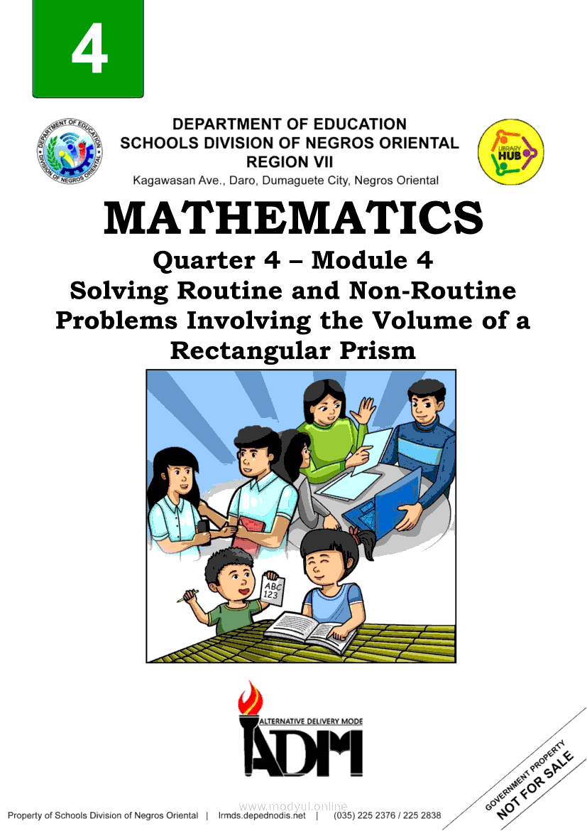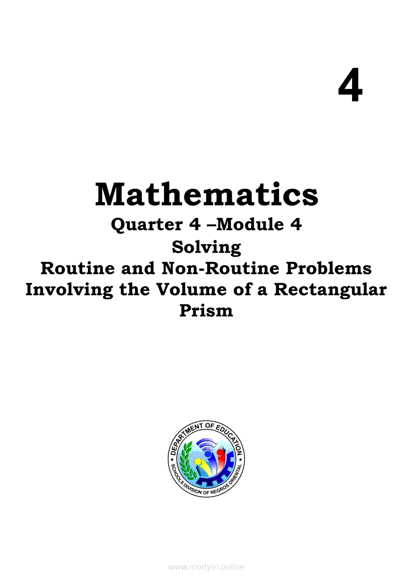 MATHEMATICS Quarter 4 – Module 4 Solving Routine and Non-Routine Problems Involving the Volume of a Rectangular PrismMay 26, 2021 Grade 4Kiumo M901 Tablet for Kids — comprehensive protection in learning, safety, and entertainment for as low as **₱2,399!. Math 4 4th QuarterRelatedMATHEMATICS Quarter 4 – Module 6 Interpreting/Drawing Inferences Based on Data Presented and Solving Routine and Non-Routine Problems in a Single/Double Vertical or Horizontal Bar GraphsMATHEMATICS Quarter 4 – Module 7 Recording Favorable Outcomes and Solving Routine and Non-Routine Problems in a Simple ExperimentMATHEMATICS Quarter 4 - Module 1 Finding the Area of Irregular Figures Made Up of Squares and Rectangles and Triangles, Parallelograms and TrapezoidsMATHEMATICS Quarter 4 – Module 5 Collecting and Organizing Data in Tabular Form and Presenting Them in a Single/Double Horizontal or Vertical Bar GraphMATHEMATICS Quarter 4 – Module 8 Expressing and Explaining the Outcomes in a Simple Experiment