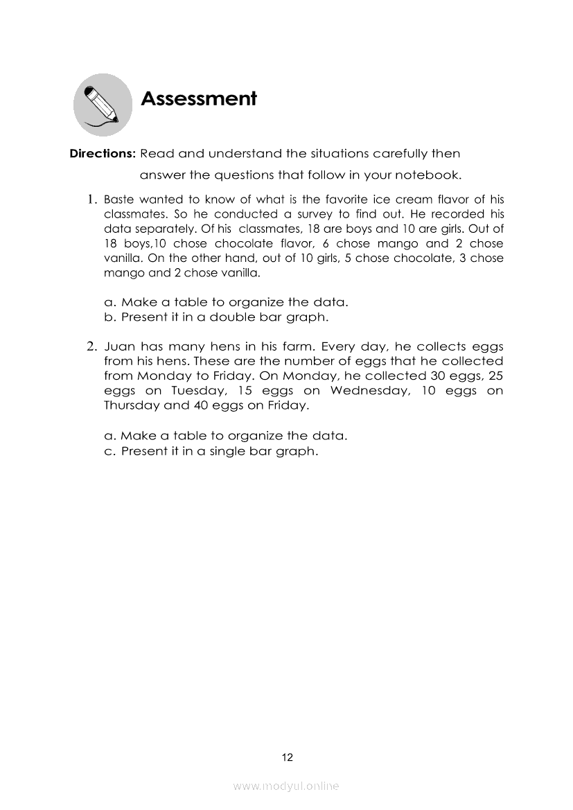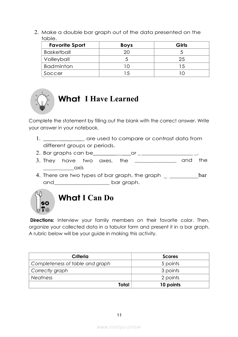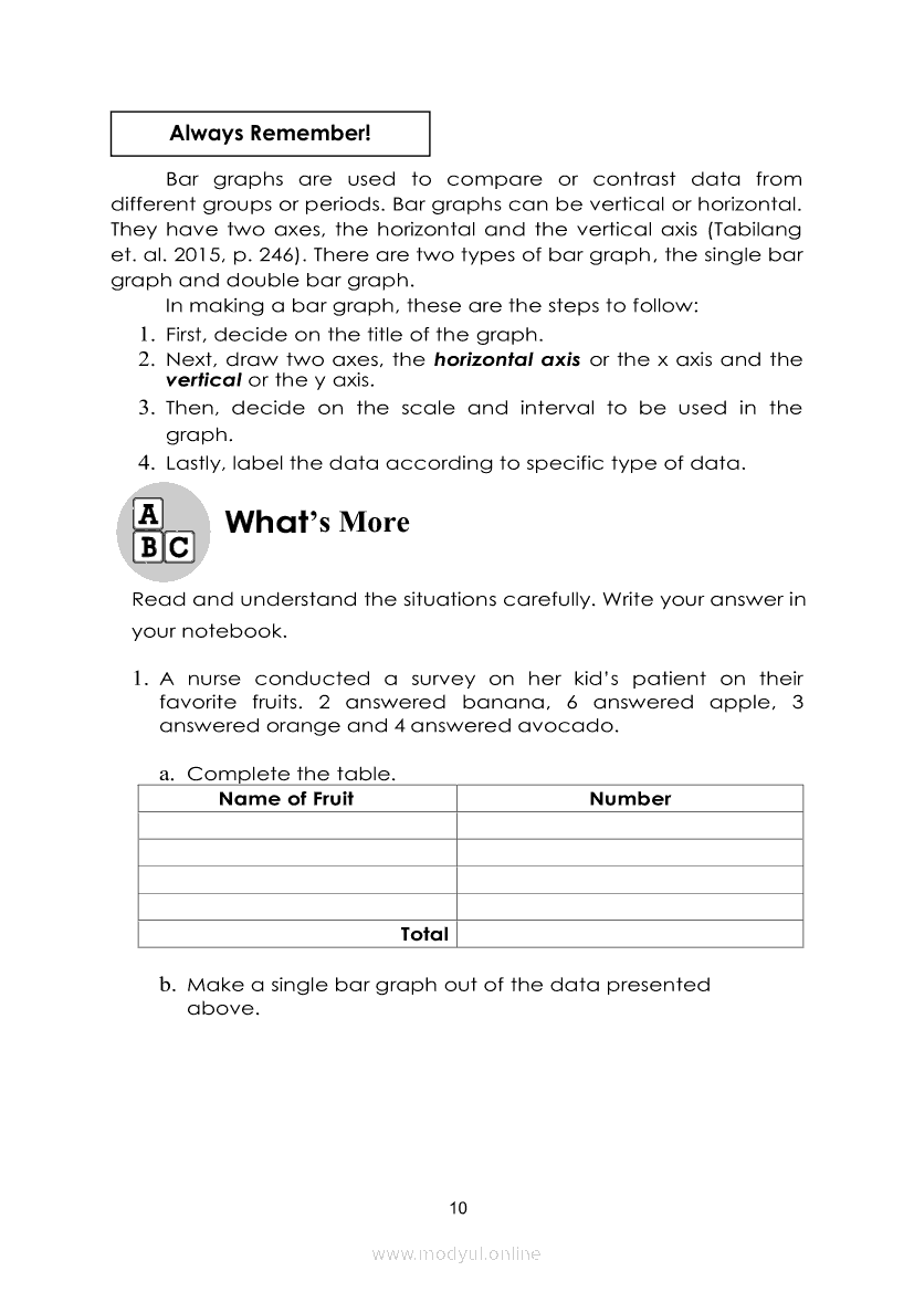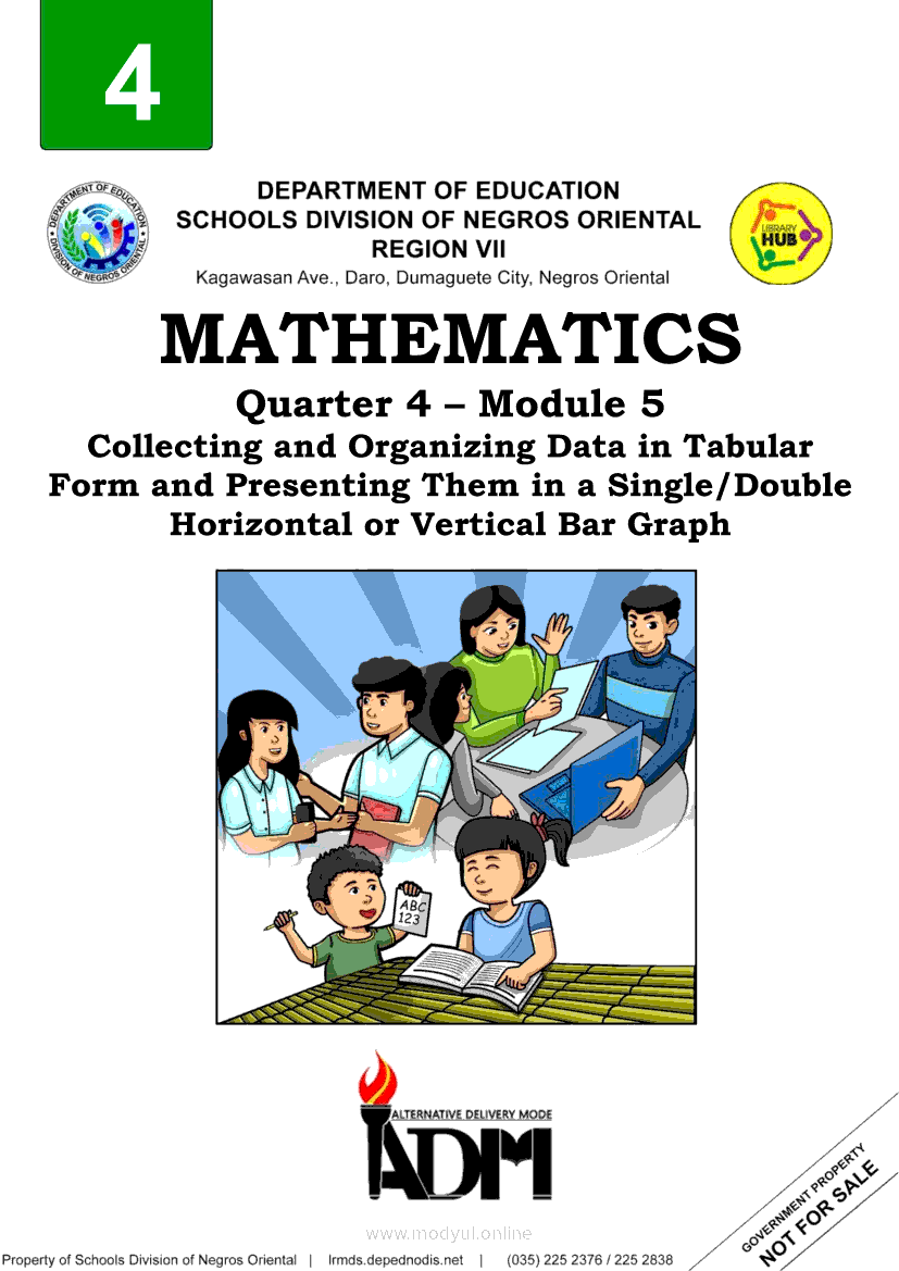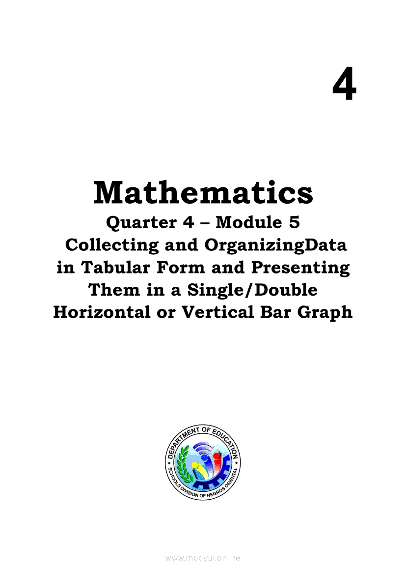 MATHEMATICS Quarter 4 – Module 5 Collecting and Organizing Data in Tabular Form and Presenting Them in a Single/Double Horizontal or Vertical Bar GraphMay 26, 2021 Grade 4Kiumo M901 Tablet for Kids — comprehensive protection in learning, safety, and entertainment for as low as **₱2,399!. Math 4 4th QuarterRelatedMATHEMATICS Quarter 4 – Module 2 Solving Routine and Non-Routine Problems Involving Squares, Rectangles, Triangles, Parallelograms, and TrapezoidsMATHEMATICS Quarter 4 - Module 1 Finding the Area of Irregular Figures Made Up of Squares and Rectangles and Triangles, Parallelograms and TrapezoidsMATHEMATICS Quarter 4 – Module 4 Solving Routine and Non-Routine Problems Involving the Volume of a Rectangular PrismMATHEMATICS Quarter 4 – Module 8 Expressing and Explaining the Outcomes in a Simple ExperimentMATHEMATICS Quarter 4 – Module 6 Interpreting/Drawing Inferences Based on Data Presented and Solving Routine and Non-Routine Problems in a Single/Double Vertical or Horizontal Bar Graphs