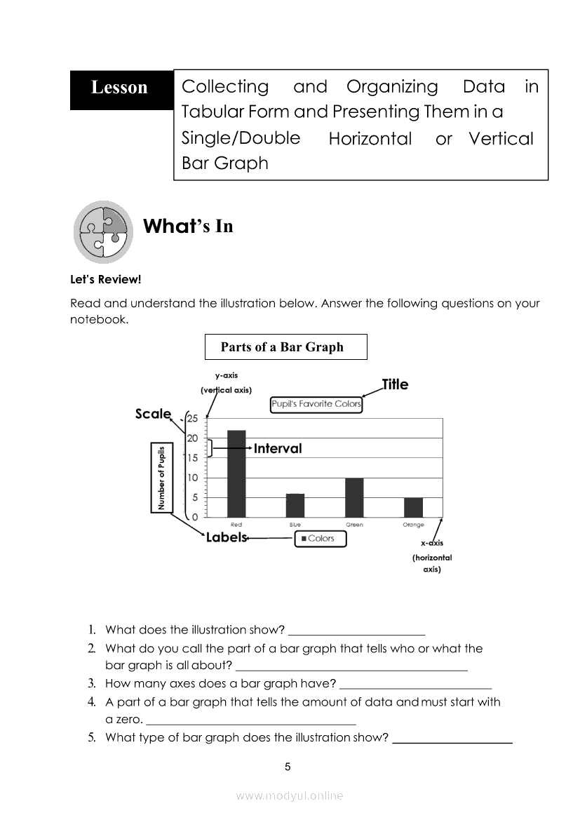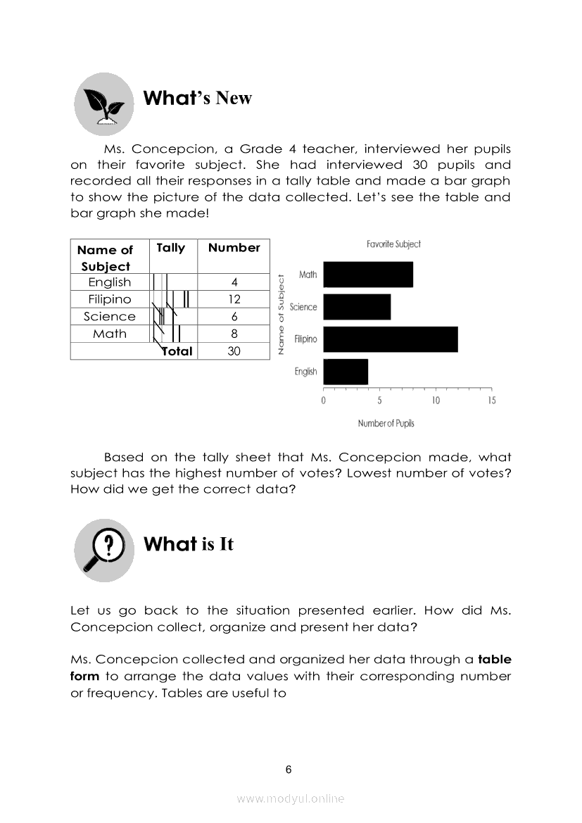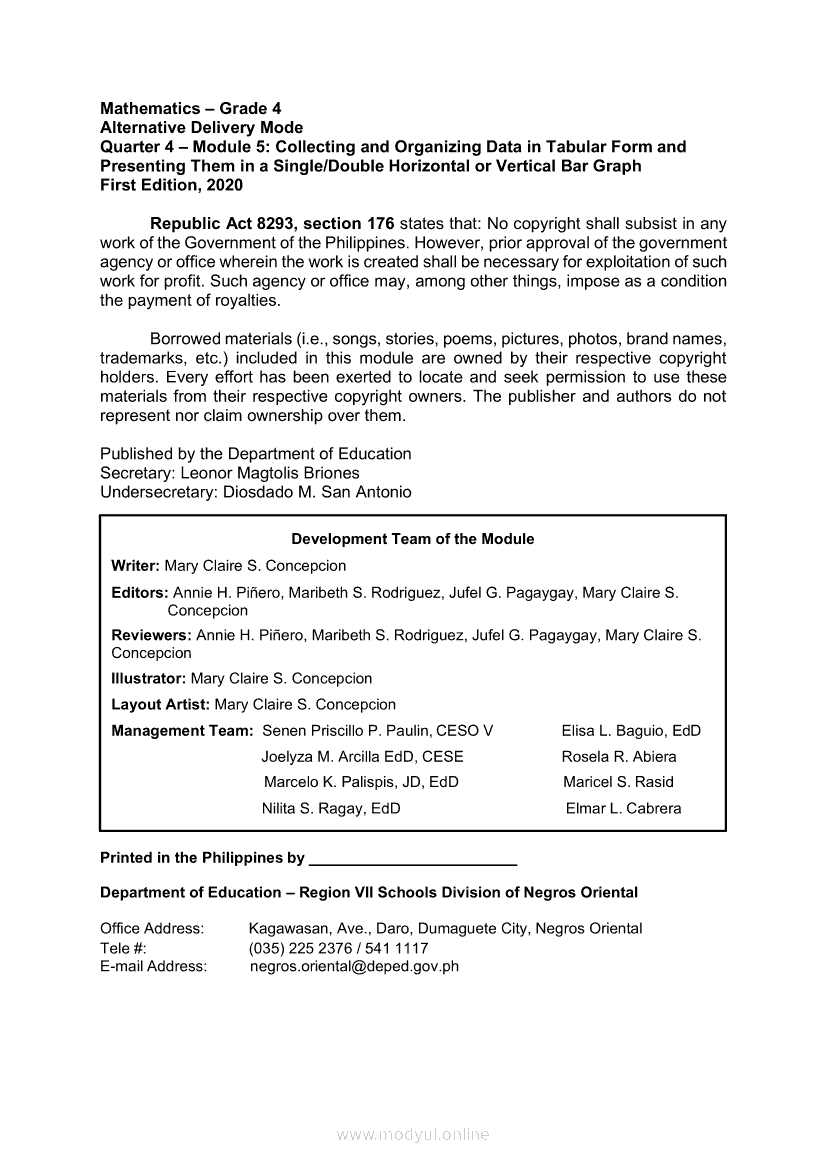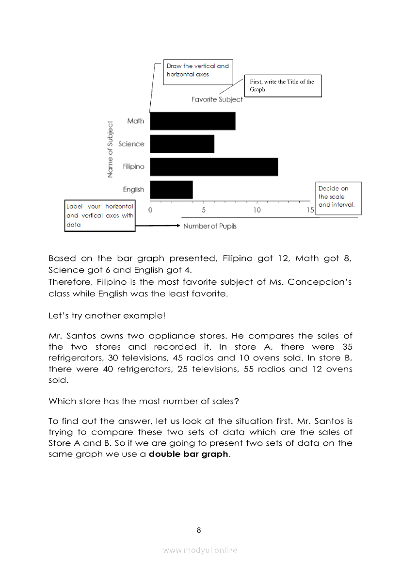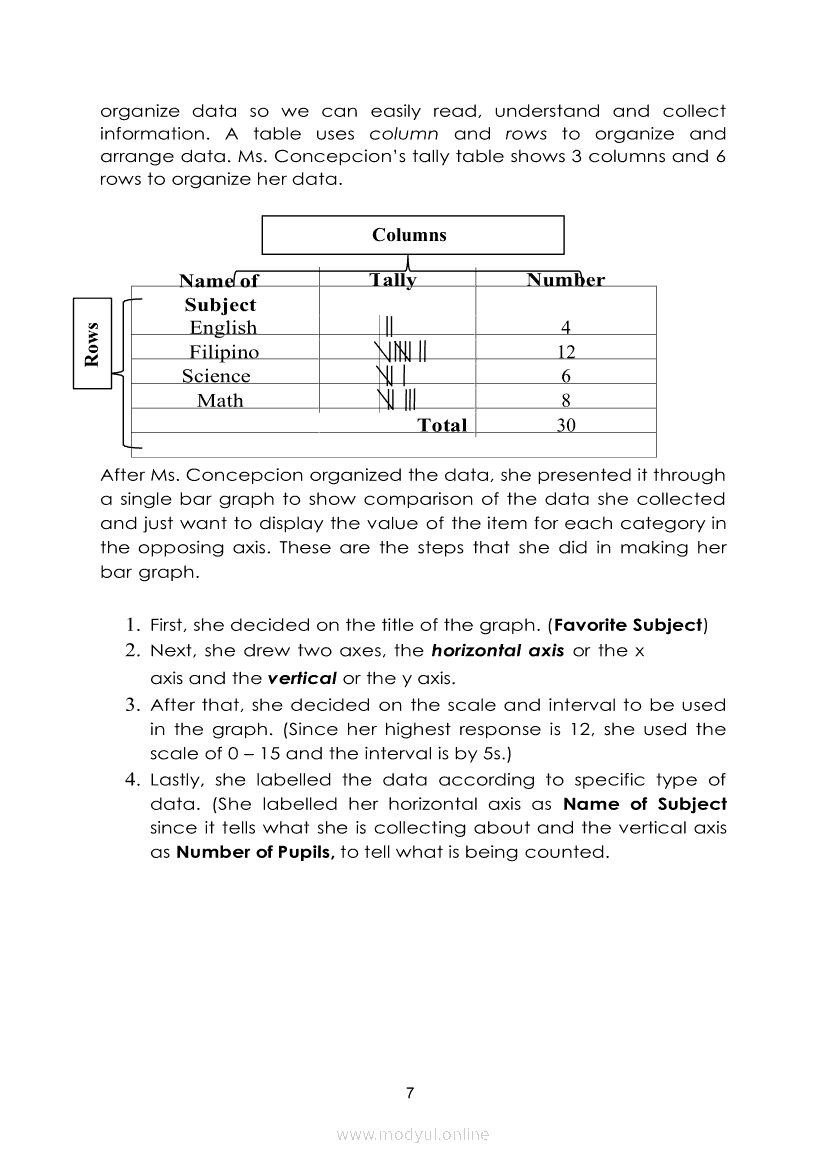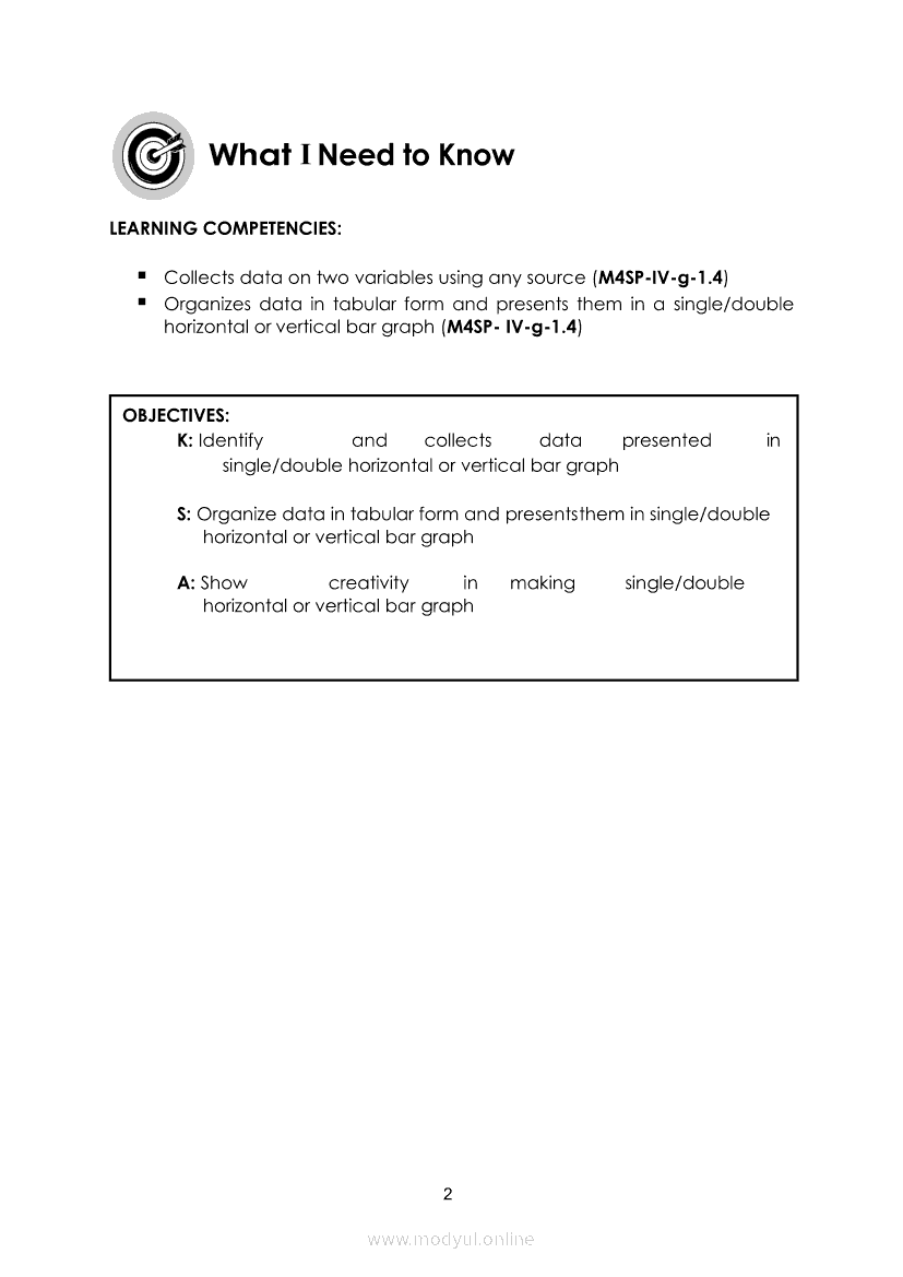 MATHEMATICS Quarter 4 – Module 5 Collecting and Organizing Data in Tabular Form and Presenting Them in a Single/Double Horizontal or Vertical Bar GraphMay 26, 2021 Grade 4Kiumo M901 Tablet for Kids — comprehensive protection in learning, safety, and entertainment for as low as **₱2,399!. Math 4 4th QuarterRelatedMATHEMATICS Quarter 4 – Module 2 Solving Routine and Non-Routine Problems Involving Squares, Rectangles, Triangles, Parallelograms, and TrapezoidsMATHEMATICS Quarter 4 - Module 1 Finding the Area of Irregular Figures Made Up of Squares and Rectangles and Triangles, Parallelograms and TrapezoidsMATHEMATICS Quarter 4 – Module 4 Solving Routine and Non-Routine Problems Involving the Volume of a Rectangular PrismMATHEMATICS Quarter 4 – Module 8 Expressing and Explaining the Outcomes in a Simple ExperimentMATHEMATICS Quarter 4 – Module 6 Interpreting/Drawing Inferences Based on Data Presented and Solving Routine and Non-Routine Problems in a Single/Double Vertical or Horizontal Bar Graphs